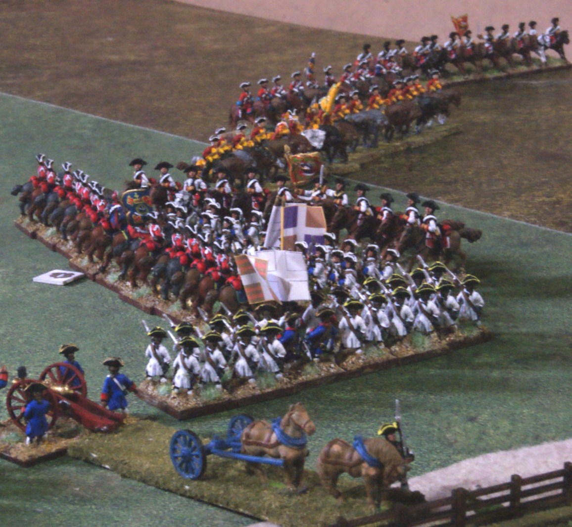 The French right flank cavalry brigade, seen before the action commenced. The Royal Allemande leads, with the Schomburg Dragoons in support.