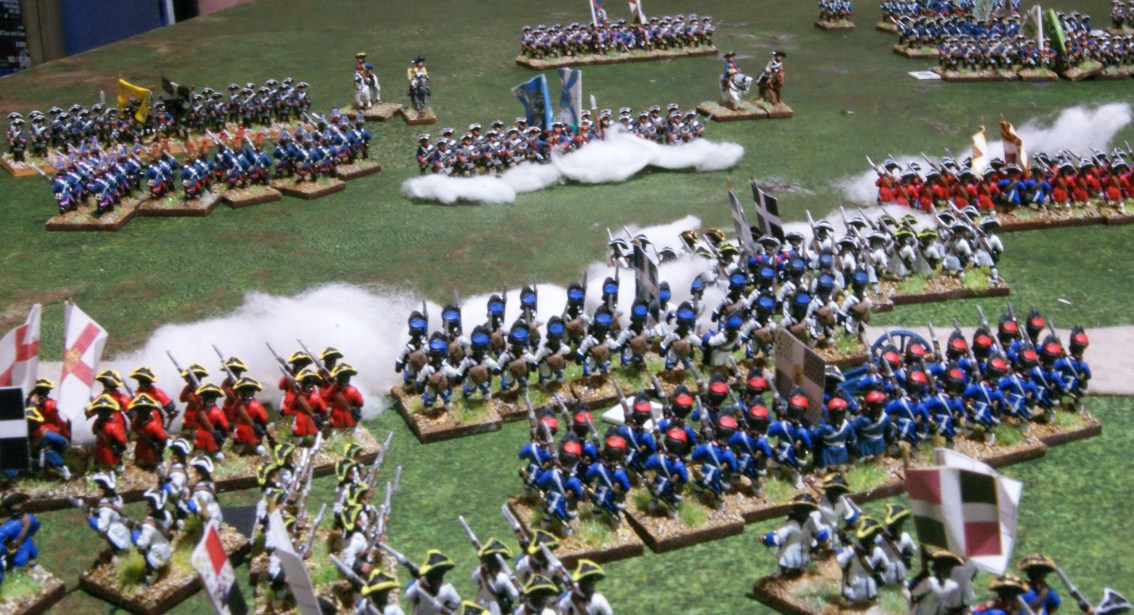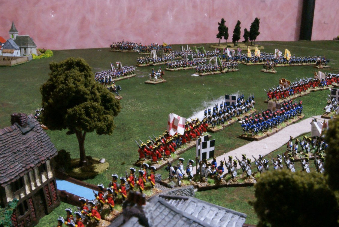 Boufflers waves his plumed hat and the whole French line rolls forward. The artillery stops moving before they leave the ridge so that they can open up – rather ineffectively, it would seem – on the Alliance position.