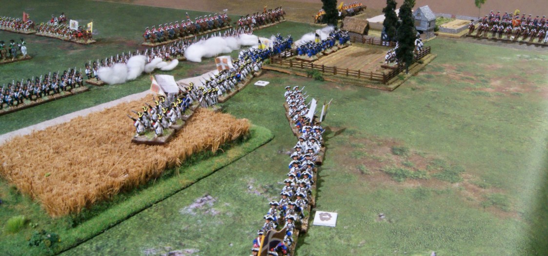 From left to right Royal Lorraine, Gardes Lorraine and Saintonge regiments move up to attack the Prussians sequestered in the farmhouse. Note the colourful and completely fanciful Colonel’s standard of the Royal Lorraine, showing the (fictitious) quarterings of the Colonel’s coat of arms.