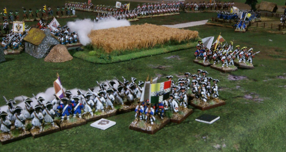 The second battalion of that brigade and battalions from the right-center brigade combine to take the farmhouse under fire, while one of the French batteries chimes in. They become bogged down in a firefight; numbers against prepared position.